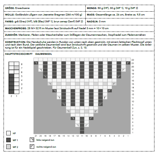 in der Höhe. Der restliche Handschuhe wird bis zur gewünschten Länge nur noch gestreift gestrickt, laut Rd 1-5 der Hauptstrickschrift, und zwar bis er den kleinen Finger bedeckt oder 7 cm ab dem Daumenkeil. Dann wie folgt Abnahmen str: Die letzte M auf Nadel 2, bzw. 4 mit MF 1 str, sodass beidseitig eine Seitenmasche entsteht, neben der abgenommen wird. Alle Abnahmen werden mit HF gestrickt.